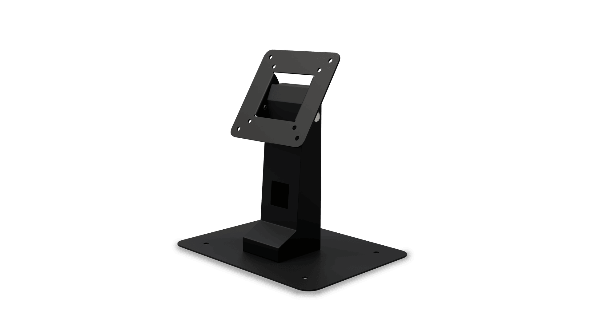 Il supporto è dotato di una connessione VESA da 75 mm che consente un facile collegamento ai display compatibili. Per applicazioni instabili, il supporto può anche essere montato su una superficie utilizzando i fori per le viti nella parte inferiore della piastra. Il supporto ha un sistema di gestione dei cavi sul retro per una facile organizzazione dei cavi e un supporto inclinabile per una facile regolazione dell'angolazione del display.